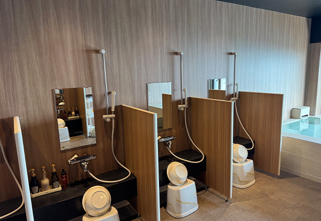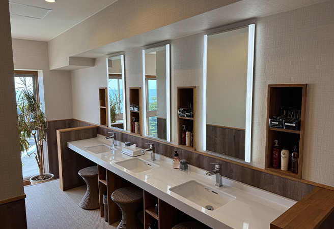 客室を2室解体し、新たなに女性浴場を新設しました。浴室は荷重と水漏れを考慮し、従来工法ではなく巨大なユニットバスとし水漏れの心配もありません。