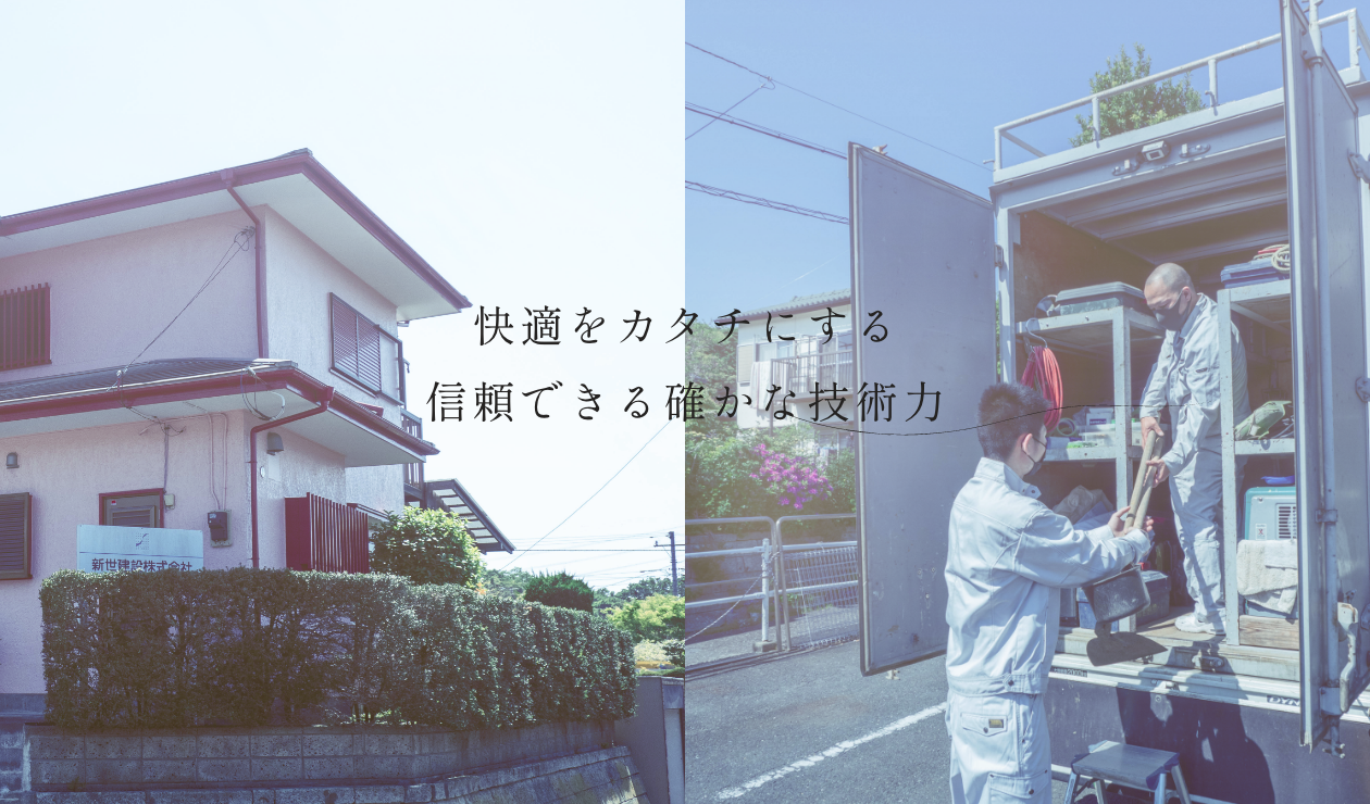 いつも隣にいて、頼りになるパートナー。それが新世建設です。 住宅のお困りごとから、新築工事まで、ひとつひとつ丁寧に対応いたします。「気持ちよく過ごせるようになった」「綺麗になって嬉しい、ありがとう」お客様の声をエネルギーに、地域の安心と安全、快適な暮らしのため新世建設は今日も走り続けます。